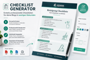 „Mit unserem Checklist Generator erstellen Sie professionelle Reinigungs-Checklisten für Büros, Treppenhäuser, Praxen und Gebäude in wenigen Sekunden. Egal ob tägliche, wöchentliche oder monatliche Reinigung –