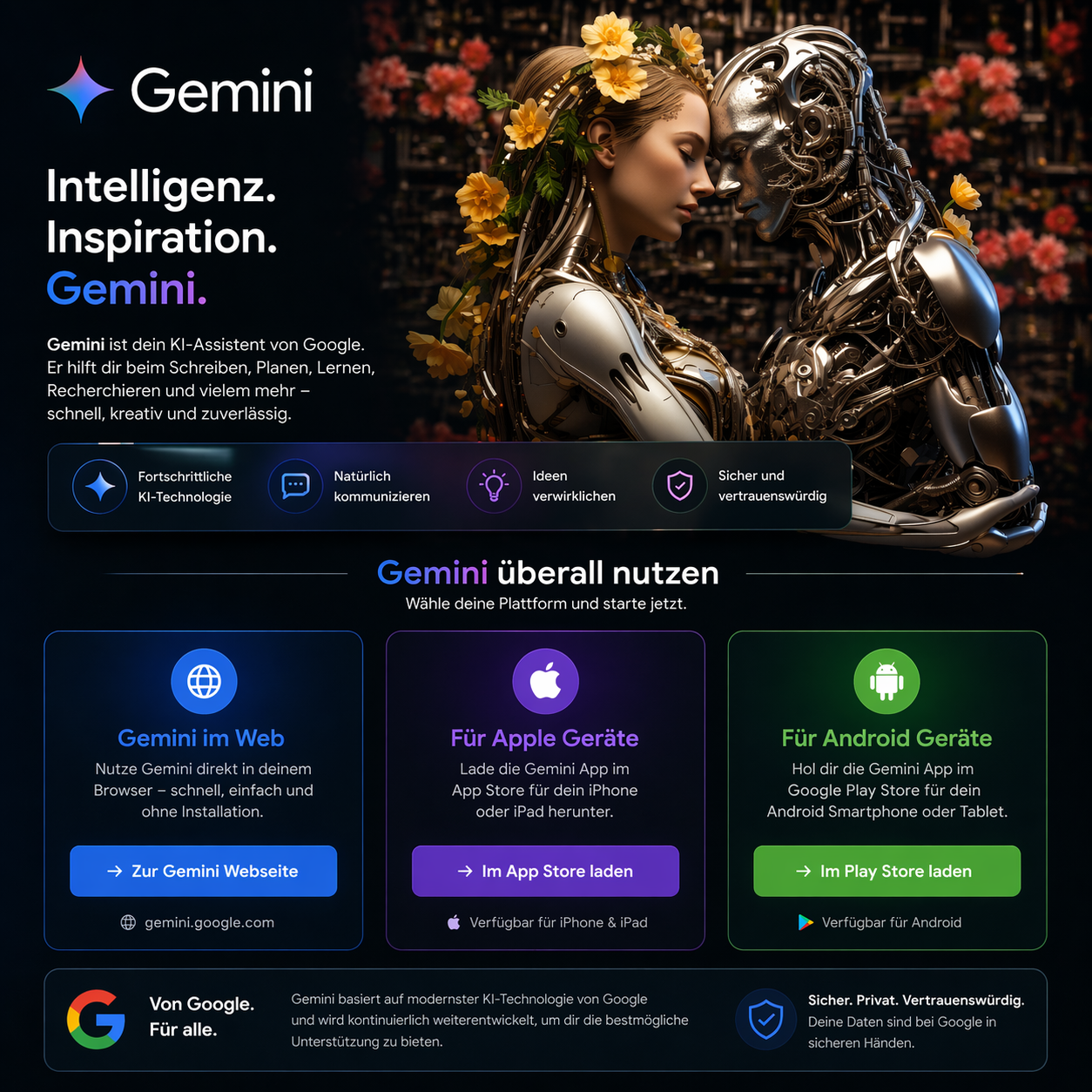 Entdecke Google Gemini auf der offiziellen Webseite oder lade die App direkt für iPhone, iPad oder Android herunter.
