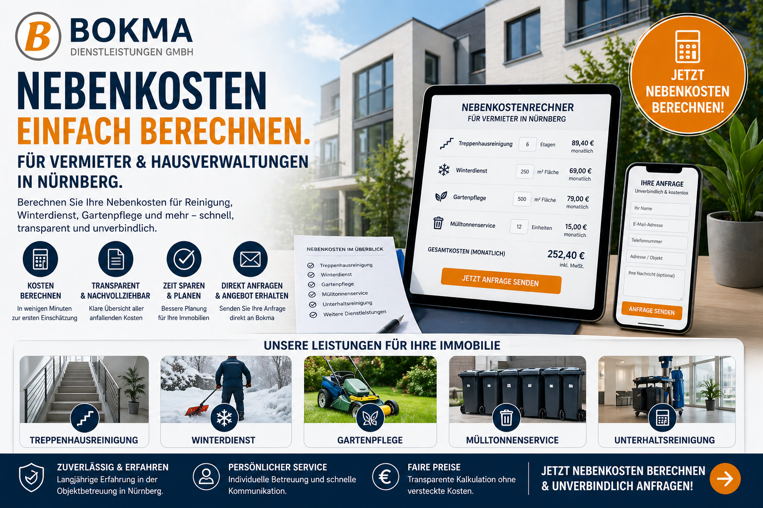 Mit dem Nebenkostenrechner von Bokma Dienstleistungen GmbH können Sie die wichtigsten Kosten schnell und transparent berechnen.