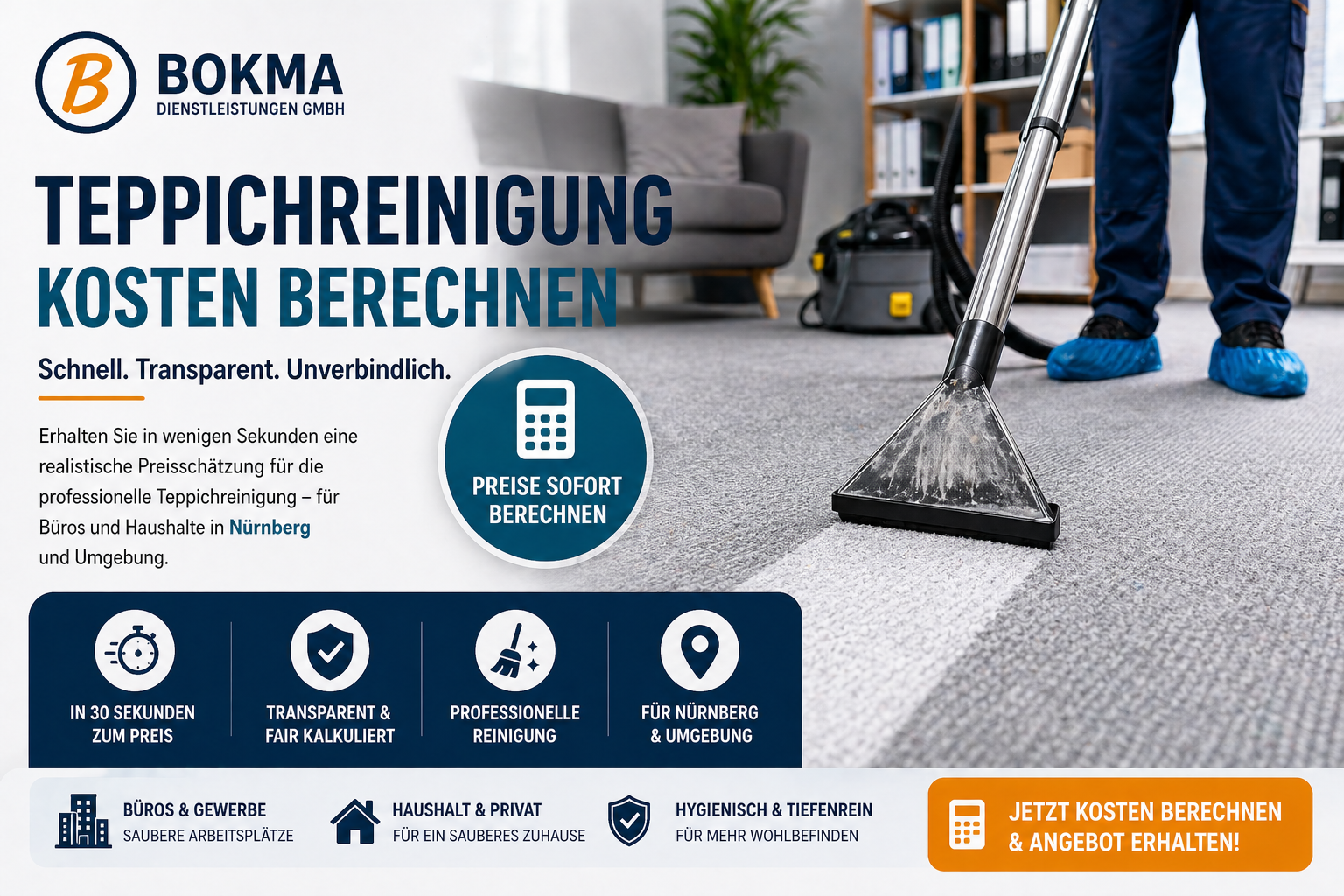Mit unserem Kostenrechner erhalten Sie in wenigen Sekunden eine realistische Einschätzung für Ihre Teppichreinigung in Nürnberg.