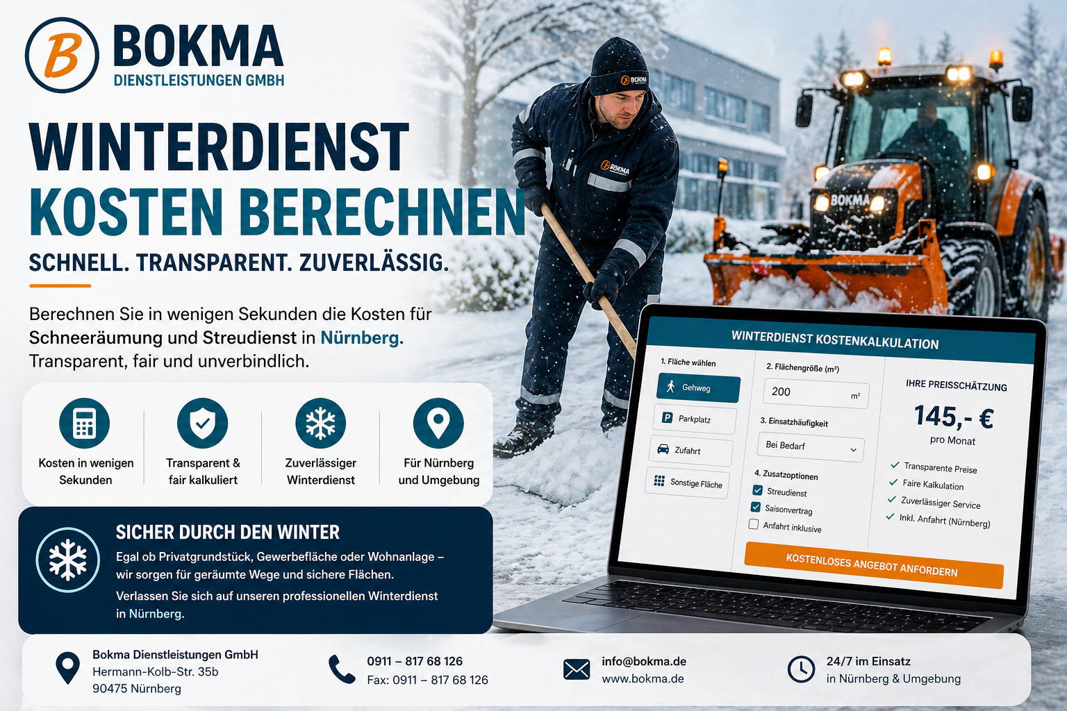 Mit unserem Kostenrechner erhalten Sie in wenigen Sekunden eine realistische Einschätzung für Schneeräumung und Streudienst – individuell auf Ihre Fläche abgestimmt.